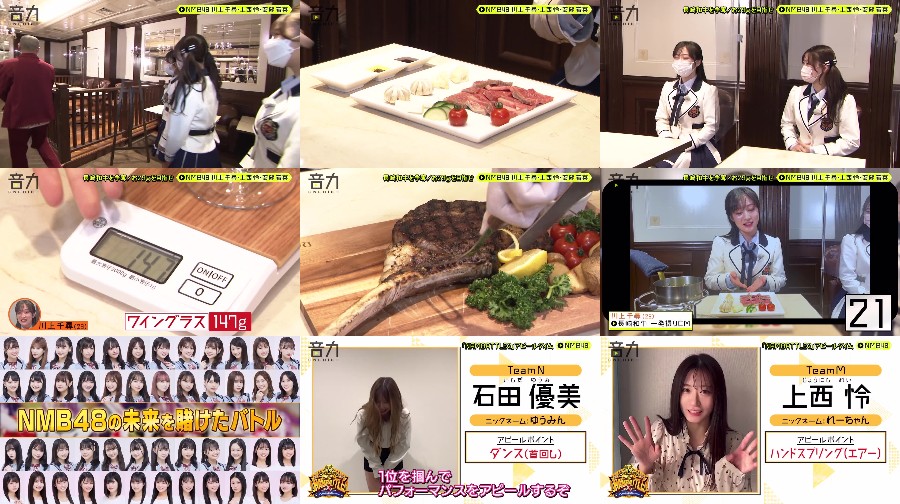 Onchika is a weekly music news / variety show. Continued from the last two weeks, this segment is a collection of appeal videos of NMB48 members as a part of their competition NAMBATTLE 2. Before that, there is also a short food segment with Jonishi Rei, Kawakami Chihiro, and Abe Wakana. There will be again more next week.
