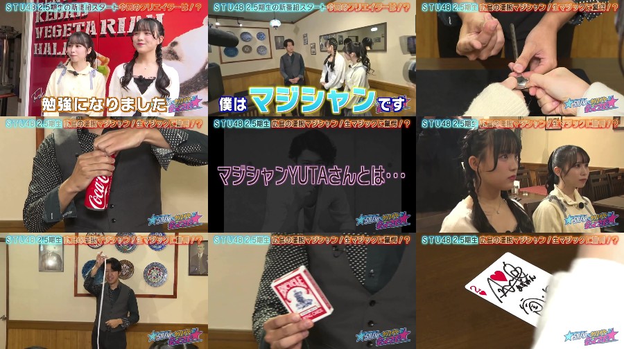 Riotsun and Azumin are left in a state of panic as they watch magician YUTA perform incredibly mysterious magic tricks. The magician’s amazing skills cause confusion, with tricks such as the rope connecting and the coke coming back. This is part of a documentary variety show where STU48 meets creators from Hiroshima and the Setouchi region, experiencing the real creative scene and a world full of individuality. The show aims to showcase the unique talents of these creators, with YUTA’s magic being the highlight of this episode. The combination of magic, mystery, and entertainment makes for an exciting and unpredictable watch. #STU48 #MagicianYUTA #HiroshimaCreators #SetouchiRegion #JapaneseVarietyShow #MagicTricks #Entertainment #DocumentarySeries