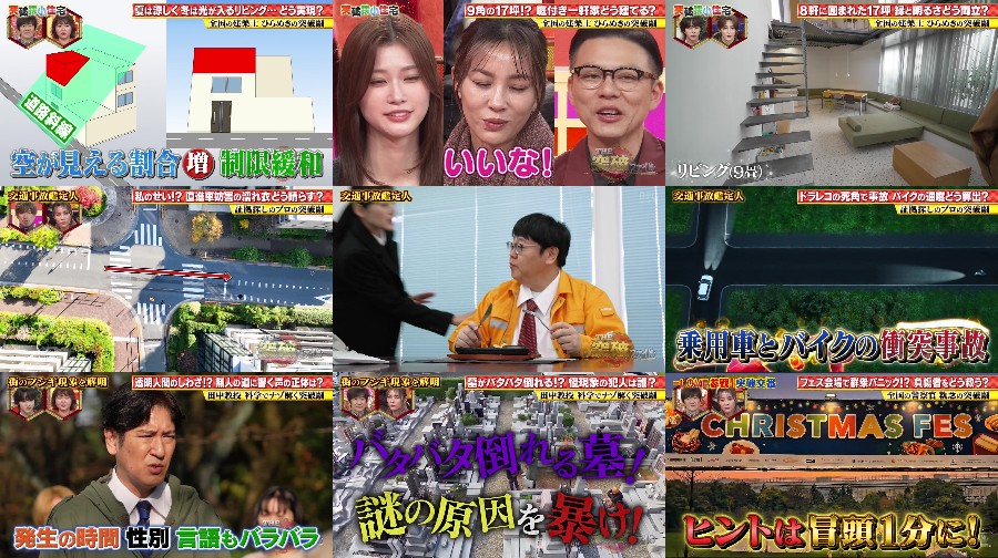 The show features a variety of segments, including the construction of a family home on a uniquely shaped plot of land, an investigation into a traffic accident, and a new project exploring unexplained phenomena. The episode begins with the challenge of building a comfortable and natural home on a small, nine-sided plot of land surrounded by other houses. The show also features a segment where experts, including high-profile guests, work to determine the cause of a collision between a bike and a car at an intersection. Additionally, the show introduces a new project, "田中教授のフシギ事件簿", where the host uses science to explain mysterious events. Another segment, "突破交番", presents a scenario where a gas explosion occurs at a concert venue, and the guests must figure out how to transport the injured. The show features a range of guests, including comedians, actors, and musicians. #JapaneseTVShow #Comedy #VarietyShow #TrafficAccident #MysterySolved #NewProject #FunnyMoments #EntertainmentTonight