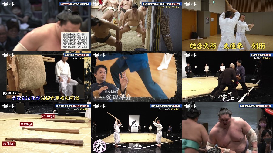 岡田准一とケンドーコバヤシが司会を務めるこの番組では、相撲の強さに迫る明鏡止水をテーマに、伊勢ケ濱親方や松村沙友理がゲスト出演します。大相撲力士の強さの源として、四股、てっぽう、すり足などの伝統の鍛錬法が紹介されます。伊勢ケ濱親方は、1月末に断髪式を控えていると同時に、筋トレで鍛えた力を相撲に必要な力に変える方法について語ります。さらに、振り棒で素振りを行う直心影流、倉本塾の砂袋や角材への拳足打ち、陳氏太極拳の馬歩など、相撲と共通点を持つ武術が紹介されます。