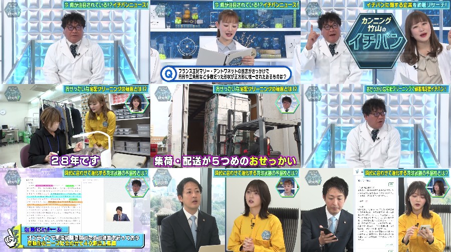 A business-themed variety show is being featured, where the secret to a company’s success is investigated, providing valuable insights for living in the present. The show is powered up by the addition of Hinatazaka46 members, including Karin Ito, Hana Chida, and Yurina Uemura, who join the research team. The companies being researched include a laundry delivery service aiming to be the best in Japan and a prep school, Zeminar, that is evolving to keep up with the new format of the judicial examination. The show also features a news segment, "Ichiban News", which includes a quiz that foreign tourists might find interesting. The cast includes Kanning Takeyama as the director and the aforementioned Hinatazaka46 members as researchers.