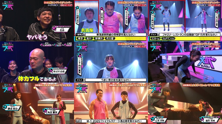 A total of 24 contestants are competing in a survival quiz battle, where both knowledge and physical strength are put to the test, with a grand prize of 1 million yen. The competition consists of multiple stages, including the "Rotating Endless Jumper" where contestants answer multiple-choice questions while jumping over bars, and the "Log Cutting Deathmatch" where teams of two compete to cut logs and earn the right to answer questions. The final stage, "Cutting Spider Balance", is a quiz competition where contestants can cut the ropes supporting their opponents, with the last person standing winning the prize. The contestants are divided into three teams: "Bun" (knowledge), "Bu" (physical strength), and "Bun-Bu" (both). The competition is directed by Autumn Toshiaki and produced by Ueda Atsuya and Fukushima Nobuhiro. #QuizBattle #SurvivalCompetition #JapaneseGameShow #KnowledgeAndStrength #CompetitionTime #QuizLovers #GameShowFans #JapaneseEntertainment