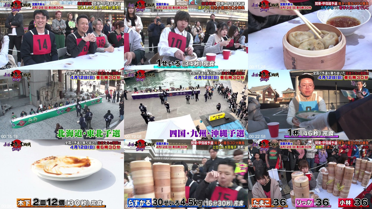A Japanese competitive-eating tournament program in which contestants attempt to eat large quantities of food within a time limit to determine the champion. Popular competitive-eating personalities and challengers participate in individual and team formats.