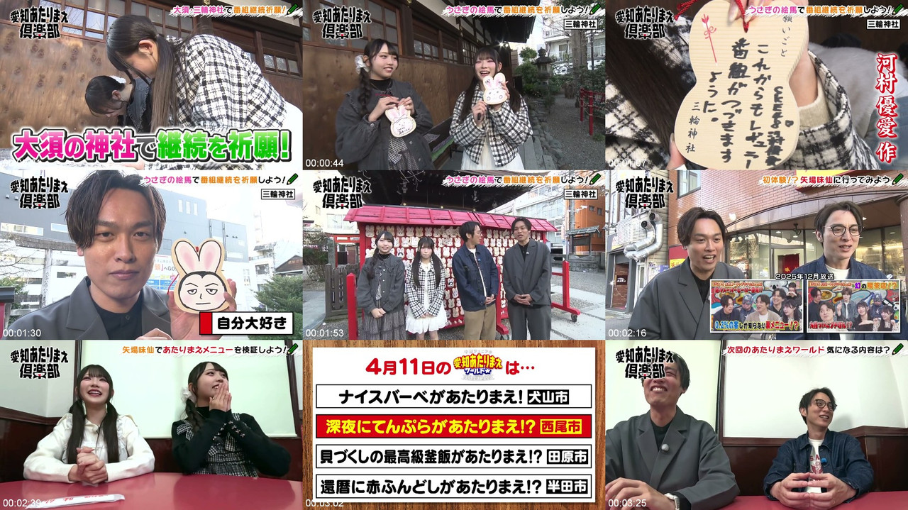 The "Aichi Atarimae Club" show, which narrowly avoided cancellation, visited Miwa Shrine in Osu to pray for its continuation. Kawamura Yua and Morimoto Kurumi from SKE48 participated in the event, where they stroked the "Lucky Petting Rabbit" and wrote their wishes on "Rabbit Ema" votive tablets. After offering their unique ema, they headed to a restaurant that serves "ordinary" Nagoya food. The show’s hosts and guests are hoping for the show’s long-term continuation, and their visit to the shrine was a part of their efforts to make that happen. #AichiAtarimaeClub #SKE48 #KawamuraYua #MorimotoKurumi #NagoyaFood #JapaneseTV #AichiPrefecture #TVLove