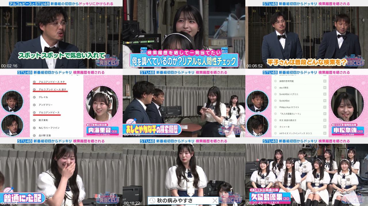The first episode of a new show features Alco & Peace and STU48, with a theme of "Guessing from Search History". The members of STU48 were initially told that they would be introducing the contents of their bags, but it was later revealed that they would actually be sharing their smartphone search histories. This unexpected twist caused chaos in the studio, which was already tense due to it being the first recording. The episode features members such as Yuuki Hirako, Kenta Sakai, Rion Okumura, Yuka Kurushima, Moe Moriya, Rina Arai, Hibiki Hamada, Fina Morimae, Nayu Komatsu, and Sakika Shimada. #AlcoAndPeace #STU48 #JapaneseComedy #SearchHistory #GuessingGame #EntertainmentNews #JapaneseTV #ComedyShow