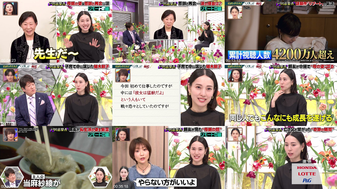 The Japanese information-variety program features a lineup of guests including actors and comedians, with hosts Lin Xiao and Ohmatsuya Aya. The main segment, "Interviewer Lin Xiao", delves into the life and career of renowned actress Erika Toda, who has starred in numerous hit films and TV dramas. The program explores her journey from a young girl who entered the entertainment industry alone to becoming a national actress, and reveals her thoughts on her craft, life, and death. The show also includes a reunion with her mentor, a discussion with her close friend Yoko Oshima, and a behind-the-scenes look at her latest film. The program aims to educate and entertain viewers by exploring various topics and trends, making it a great way to spend a Sunday evening. #JapaneseTV #ErikaToda #LinXiao #VarietyShow #SundayNight #JapaneseEntertainment #ActressLife #BehindTheScenes
