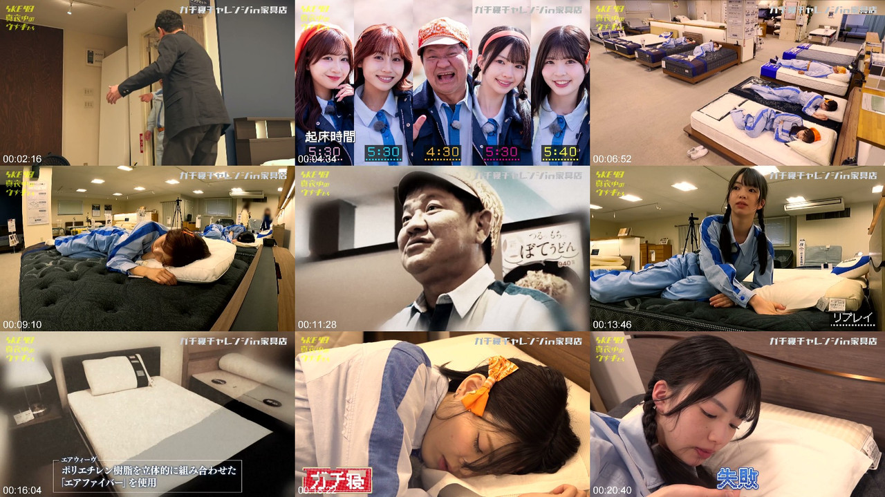 The SKE48 members, Hinano Aoumi, Ayaka Ota, Ena Suzuki, and Miyabi Hasegawa, are participating in a unique challenge called the "Serious Sleep Championship on a Furniture Store Bed" in Kota Town, Aichi Prefecture. The challenge takes place in a huge furniture store with 40 high-quality beds, featuring high-rebound mattresses made in Kota Town that are favored by top athletes. The idols quickly fall asleep, but their peaceful slumber is disrupted by Chance Ooshiro’s loud snoring and mysterious sleep-talking. To make matters more challenging, a customer unexpectedly appears, putting the idols’ ability to sleep for 20 minutes without reacting to the test. The scene is a must-see, showcasing the idols’ defenseless sleeping faces. #SKE48 #SleepChampionship #FurnitureStore #IdolChallenge #JapanesePopCulture #KotaTown #AichiPrefecture #SKE48Members